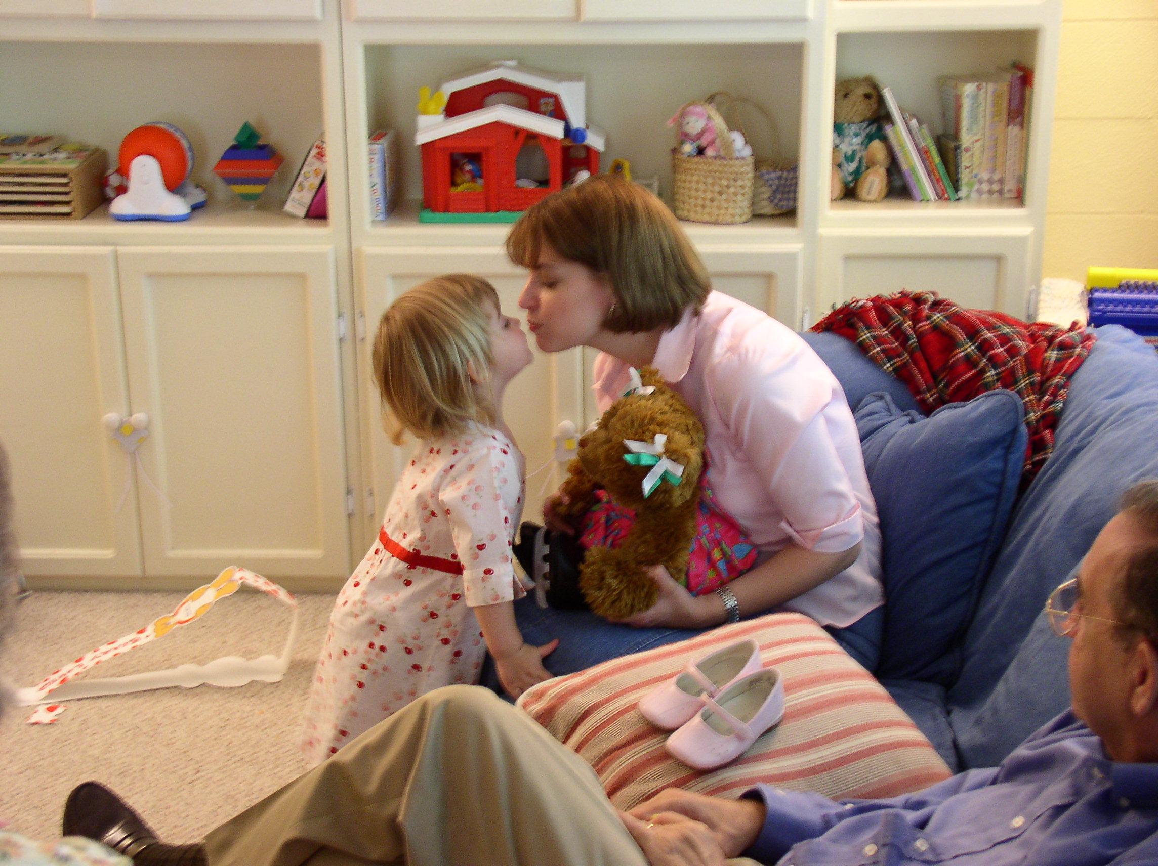 Kim gives Darby a kiss after she opens her Mother's Day gift. Mommy Bear was created just for Kim by Darby at the Teddy Bear Factory. |